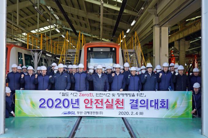 부산김해경전철은 4일 경남 김해시 삼계동 경전철 차량기지에서 김환국 대표이사를 비롯한 안전운행 실무자, 본사 직원들이 참가한 가운데 안전실천 결의대회를 개최했다고 밝혔다.