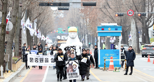 ▲ 故 문중원 기수 시민대책위와 유족들이 지난달 6일 오전 고인의 사망 진상규명 및 책임자 처벌을 촉구하며 서울 종로구 정부서울청사 앞에서 행진하고 있다. [뉴시스]