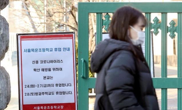 ▲ 서울 양천구 목운초등학교 재학생 학부모 1명이 신종 코로나바이러스 감염증 자가격리 및 능동감시대상자로 통보 받은 가운데 지난 4일 오전 목운초의 닫힌 교문 뒤로 이날부터 오는 7일까지 휴업한다는 안내문이 세워져 있다. [뉴시스]