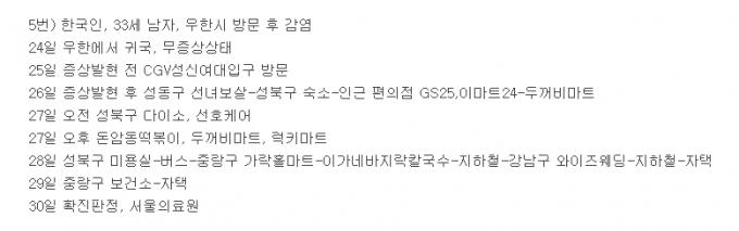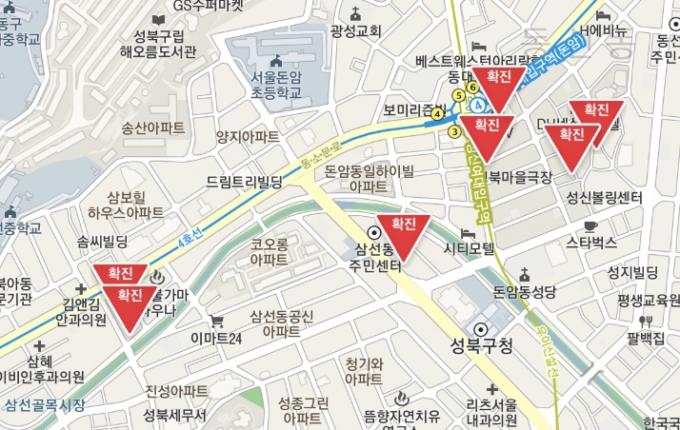 이들 장소는 신종 코로나바이러스 감염 확진자가 다녀간 곳이거나 그 주변이다. 해당 지역은 각종 코로나 지도에서 붉은 마크로 '낙인'찍혀 있다. 5번 확진자는 나흘에 걸쳐 이곳을 포함해 성북구 일대를 돌아다녔다.