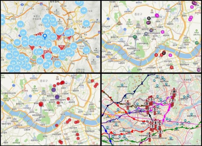 ▲ 서울 전역에 다양한 표시를 해 둔 코로나 지도 사이트들. (왼쪽 위부터 시계방향으로) 코로나 알리미, 코로나 맵, 신종 코로나 바이러스 현황지도, 코로나우 [각 사이트 캡처]