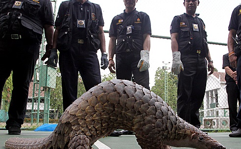 ▲ 태국 세관 당국이 수도 방콕에서 구조된 천산갑 1마리를 보고 있다.[뉴시스]