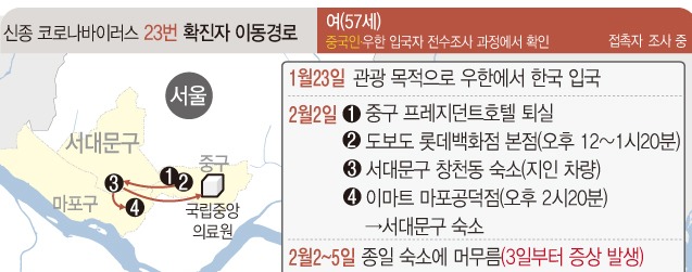 질병관리본부 중앙방역대책본부는 9일 오후 2시 정례브리핑에서 23번째 확진자(57세 여성, 중국인)가 지난 2일 롯데백화점 본점의 4층 매장과 1층 세금환급 카운터, 지하 1층 음식점을 방문했다고 밝혔다.