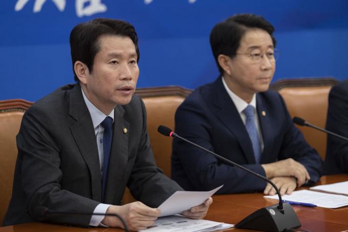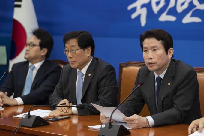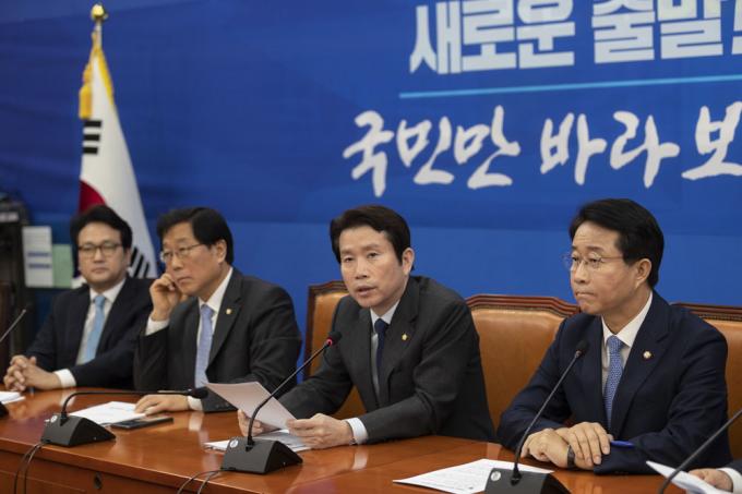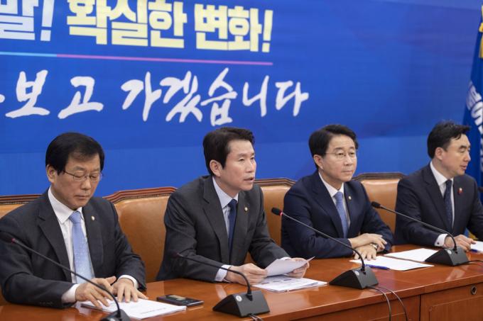 더불어민주당 이인영 원내대표(왼쪽 두번째)가 11일 오전 서울 여의도 국회에서 열린 당 원내대책회의에 참석해 발언하고 있다.