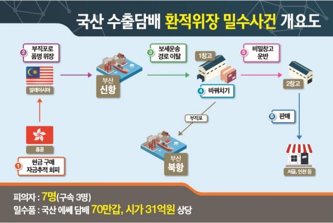 부산본부세관은 11일 외국으로 수출된 31억 원 상당의 국산 담배를 부산항을 거쳐 러시아로 가는 환적화물로 위장해 국내로 밀수입한 A(73) 씨 등 3명을 특정범죄가중처벌 등에 관한 법률 위반 혐의로 구속했다고 밝혔다. 또 일당 3명을 같은 혐의로 불구속하고 달아난 자금책 B(43) 씨를 뒤쫓고 있다.