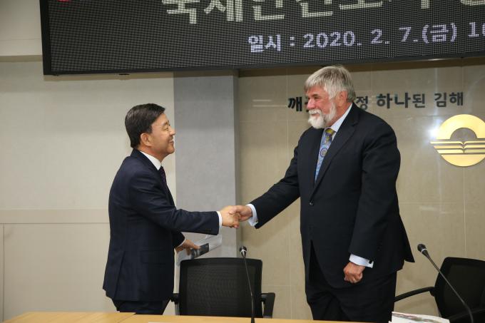 ▲ 허성곤 경남 김해시장(왼쪽)이 12일 스웨덴 스톡홀름 국제안전도시 공인센터(ISCCC) 데일 핸슨 의장으로 부터 국제안전도시 공식 지정서를 받고 있다. [김해시 제공]