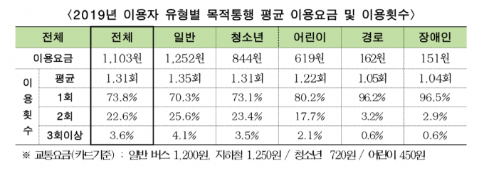 일 평균 지하철 601만·버스 517만·따릉이 5만 건 이용 서울 시민은 대중교통을 이용하여 목적지까지 이동시 평균 1103원을 지불하고, 1.3회 환승하는 것으로 나타났다. 환승 할인 제도의 경우 1인당 연간 53만원의 교통비 절감 효과가 있었다.
