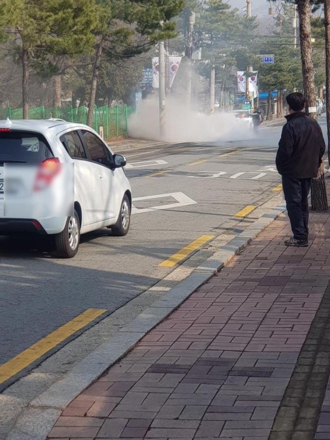▲ 시민들이 연기에 휩싸인 아반떼 차량에 난 불을 소화기를 이용해 끄려고 하는 중이다. [이행우 씨 제공]