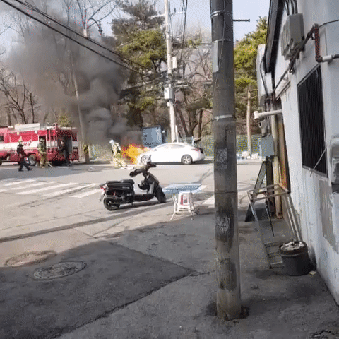 ▲ 14일 서울 강북구 백련사 인근에 주차된 아반떼 차량에서 난 화재로 소방 대원들이 출동해 불을 끄고 있다. [이행우 씨 제공]