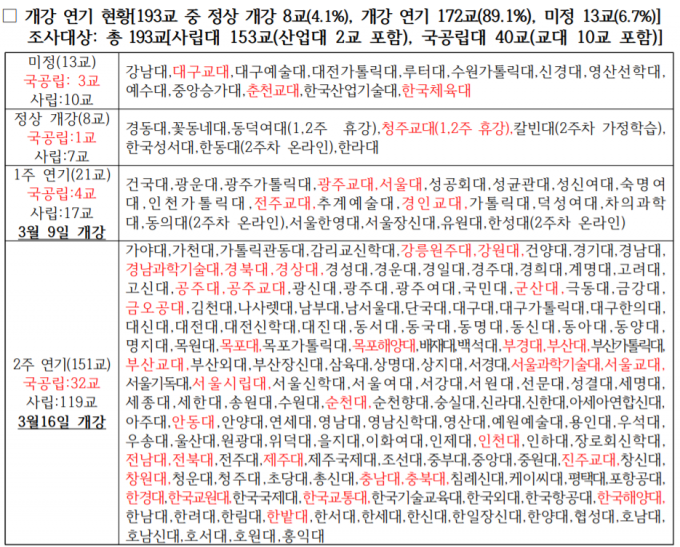 코로나19 확산으로 전국 4년제 대학 172개(89.1%)가 개강을 연기했다.