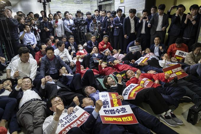 지난해 4월 '국회 패스트트랙(신속처리안건) 충돌 사건'과 관련해 열린 첫 재판에서 한국당 의원들의 변호인들은 정당행위였다며 혐의를 부인했다.