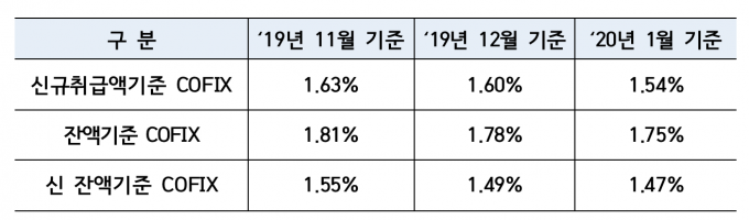 은행연합회가 전날 발표한 '2020년 1월 코픽스'에 따르면 1월 신 잔액 기준 코픽스는 1.47%, 신규취급액 기준 코픽스는 1.54%로 전월보다 각각 0.02%포인트, 0.06%포인트 하락했다.