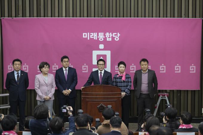 미래통합당 의원총회가 18일 오전 서울 여의도 국회 제4회의장에서 열린 가운데 정병국 의원(왼쪽 네번째)이 발언하고 있다.