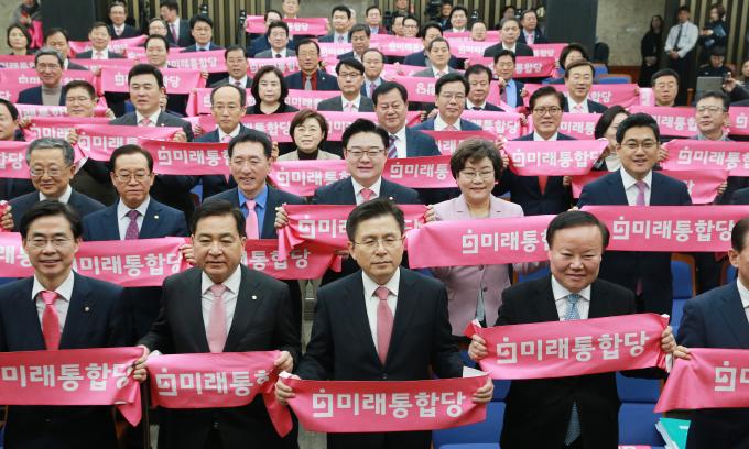 미래통합당 황교안 대표(앞줄 왼쪽 세 번째), 심재철 원내대표(두 번째)와 당 의원들이 18일 오전 서울 여의도 국회 제4회의장에서 열린 의원총회에 참석해 당명이 적힌 머플러를 들고 구호를 외치고 있다.