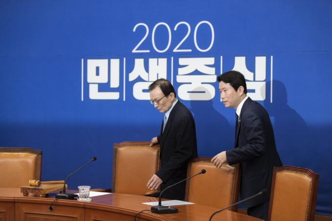 더불어민주당 이해찬 대표(왼쪽)와 이인영 원내대표가 19일 오전 서울 여의도 국회 당대표회의실에서 열린 최고위원회의에 참석하고 있다.
