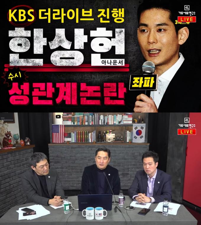 유튜브 '가로세로연구소' 채널의 김세의 가로세로연구소 대표, 강용석 변호사, 유튜버 김용호 연예부장은 지난 18일 온라인 라이브 방송을 통해 최근 이슈에 관해 얘기했다.