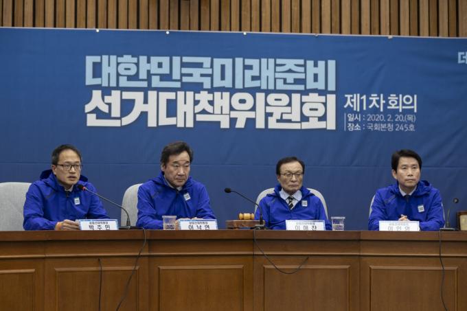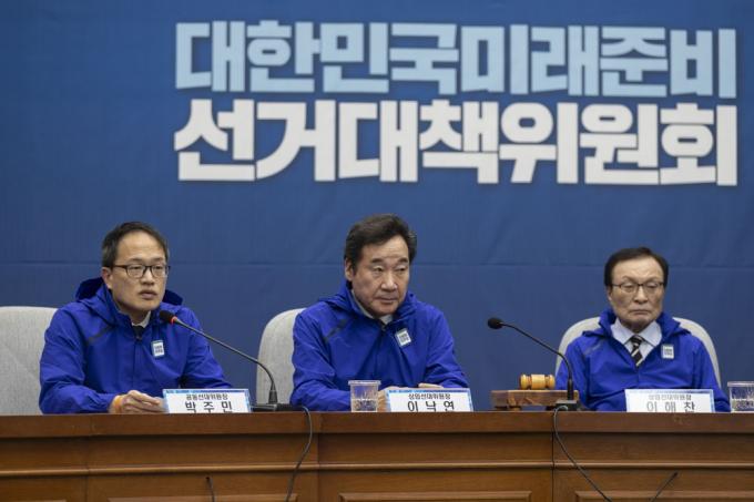 더불어민주당 박주민 최고위원(왼쪽)이 20일 오후 서울 여의도 국회 제3회의장에서 열린 당 선거대책위원회 제1차 회의에 참석해 발언하고 있다.