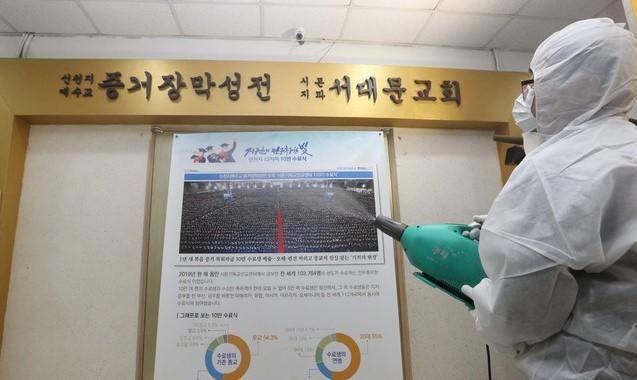 ▲ 코로나19 확진자가 늘어나는 등 공포가 지속되고 있는 가운데 21일 오후 서울 서대문구 신천지예수교 서대문시온교회에서 방역관계자가 방역 작업을 하고 있다. [정병혁 기자]