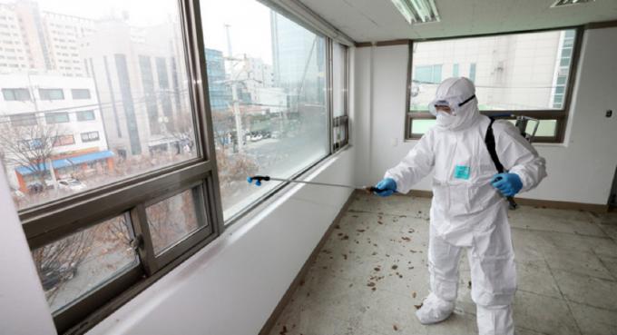 ▲ 22일 부산과 경남지역에 코로나19 확진자가 3명 추가 발생했다. 사진은 방역요원이 건물 내부에 소독을 실시하고 있는 모습. [뉴시스]