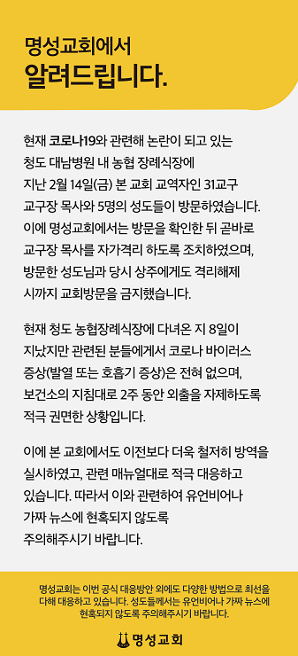 청도 다녀온 후 예배 참석 국내 대형교회 중 하나인 서울 강동구 명성교회 목회자와 신도들이 청도 대남병원 장례식장을 찾았다가 자가 격리조치된 것으로 파악됐다.
