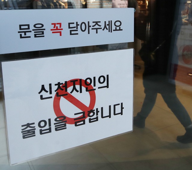 ▲코로나 19가 전국적으로 확산세를 보이는 가운데 지난 23일 1898 명동성당 입구에 '신천지인의 출입을 금합니다'라는 안내문이 붙어 있다. [뉴시스]