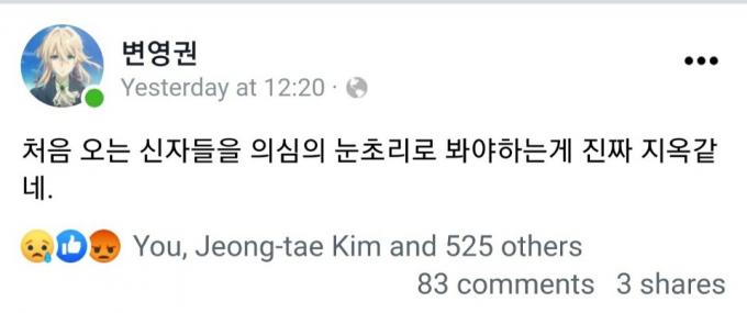 변영권 제천 예사랑감리교회 목사는 페이스북에 "처음오는 신자들을 의심의 눈초리로 봐야하는 게 지옥같다"는 글을 올렸다.