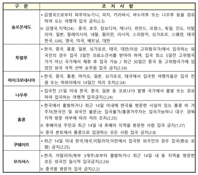 외교부는 25일 오후 10시 기준 한국 경유 외국인의 입국 금지와 자가격리, 입국 절차 강화 등을 실시한 국가가 25개국으로 집계됐다고 발표했다. 23일 발표보다 10개국이 늘어났다.