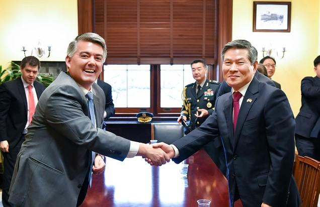 ▲ 정경두 국방부 장관이 25일(현지시간) 미국 의회를 방문해 코리 가드너 미국 상원 외교위 동아시아태평양 소위원장과 한반도의 완전한 비핵화와 평화정착을 위한 한미 양국 간 공조와 동맹 발전 방안에 대해 논의하기 전 악수를 하고 있다. [국방부 제공]