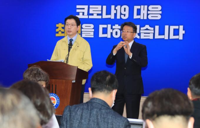 ▲ 김경수 경남지사가 27일 도청 프레스센터에서 코로나19 확진자 추가 발생 현황과 대책을 설명하고 있다. [경남도 제공]