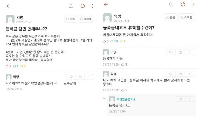 또 다른 사용자는 "2주 개강 연기에 2주 온라인 강의면 (전체 강의 중) 거의 1/4에 육박한다"며 "회사 같은 경우는 무급휴가로 처리하는데 등록금 감면을 해주지 않느냐"는 글을 남겼다.
