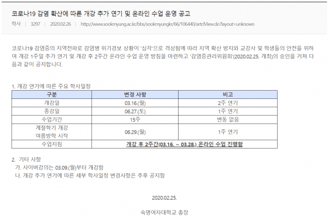 건국대학교 관계자는 "코로나19가 지역사회로 빠르게 확산되고 감염병 위기 경보가 '심각' 단계로 격상함에 따라 추가적 대응을 할 수밖에 없다"며 온라인수업의 이유를 밝혔다.