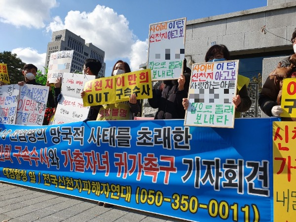 이날 오전 11시 고발장 제출에 앞서 전피연은 서울 서초구 대검청사 앞에서 기자회견을 열고 이만희 총회장에 대한 구속수사를 촉구했다. 기자회견에는 전피연 관계자들과 신천지에 빠져 집을 나간 자녀를 둔 부모들이 참석했다.