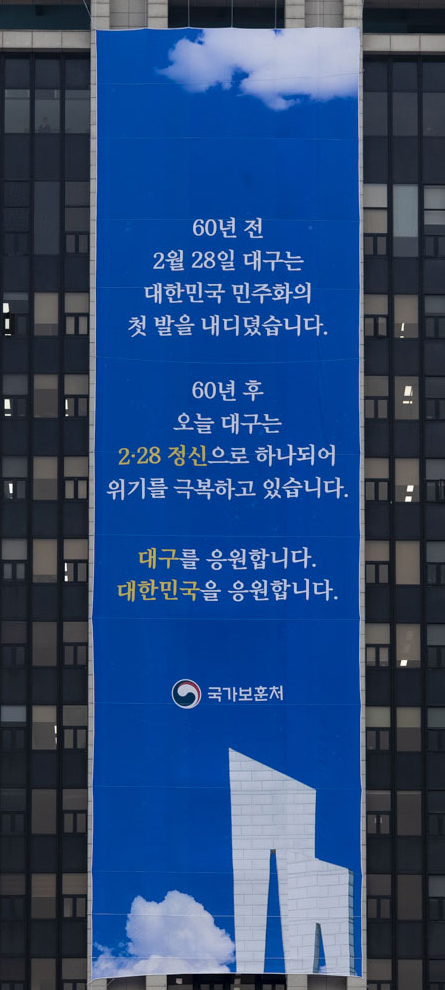 그로부터 60년이 지난 2월 28일 오늘, 대한민국 서울정부청사엔 커다란 배너가 걸렸다. 60년 전 민주화의 촛불을 댕겼던 대구의 불굴의 정신으로 오늘 닥친 코로나 위기를 넘자는 메시지다.