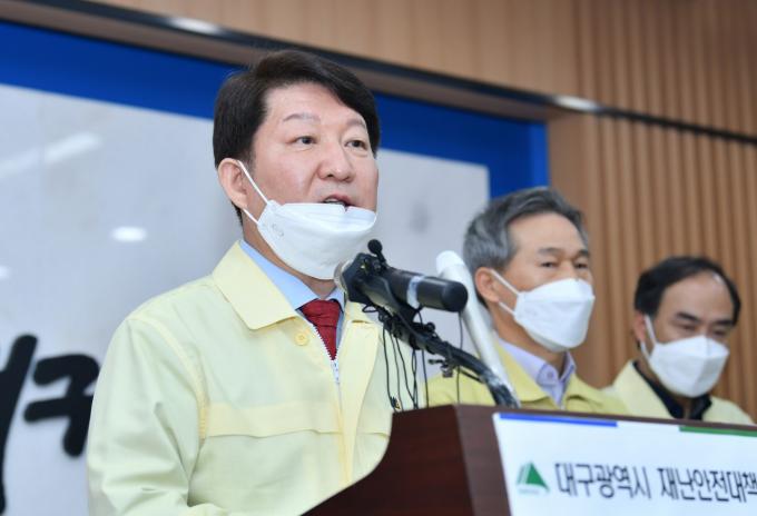 ▲ 권영진 대구시장이 지난 20일 오전 코로나19 관련 긴급브리핑을 하고 있다. [대구시 제공]