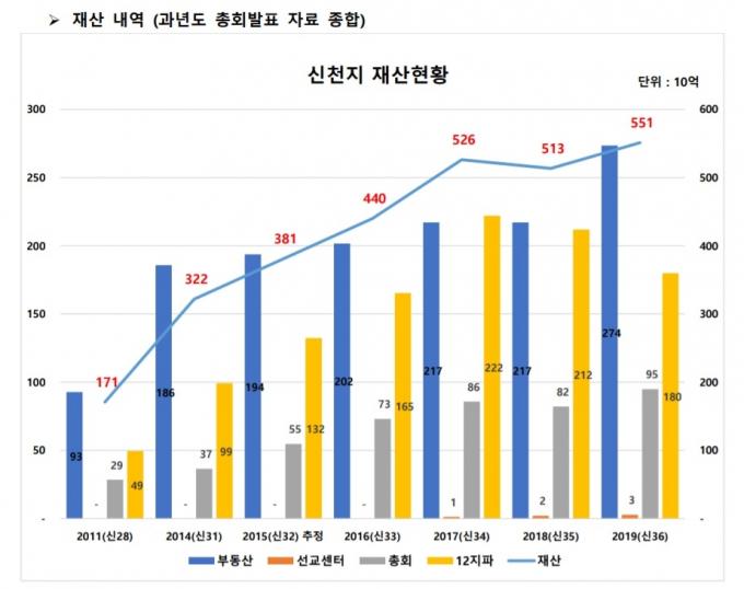 29일 유튜브 계정인 종말론사무소가 발표한 '2020년 신천지 긴급 보고서'에 따르면, 신천지의 전체 재산 규모는 5513억2200만 원으로 파악됐다.