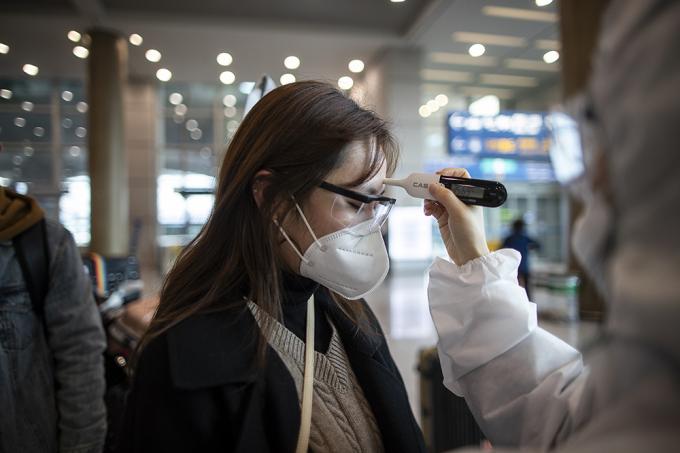 ▲ 코로나19의 확진자가 늘어나는 등 공포가 지속되고 있는 가운데 지난달 25일 오후 인천국제공항 제1터미널로 입국한 중국 유학생들이 학교 측이 마련한 버스에 탑승하기 전 체온 검사를 하고 있다.[정병혁 기자]
