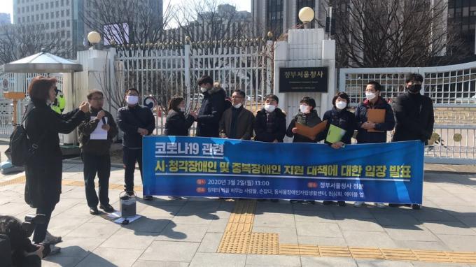 이들 시민단체는 2일 오후 1시 광화문 정부서울청사 앞에서 '코로나19 관련 시, 청각장애인 및 중복장애인 지원 대책에 대한 입장 발표' 기자회견을 열었다.