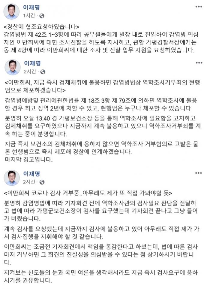 이 지사는 이날 자신의 페이스북에 "이만희씨는 조금 전 기자회견에서 책임을 통감한다고 하셨는데, 법에 따른 검사마저 거부하면 그 회견의 진실성을 의심받을 수 있다는 점 상기하시기 바란다"고 당부했다.