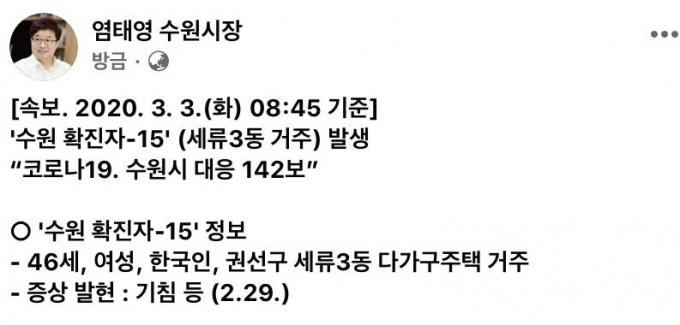 염태영 수원시장은 3일 페이스북을 통해 "영통구 망포1동 동수원 자이 1차 아파트 거주하는 11세 A 양과 권선구 세류3동 다가구주택 거주하는 46세 여성 B 씨가 확진자로 판정됐다"고 밝히고 일부 역학조사 결과를 공개했다.