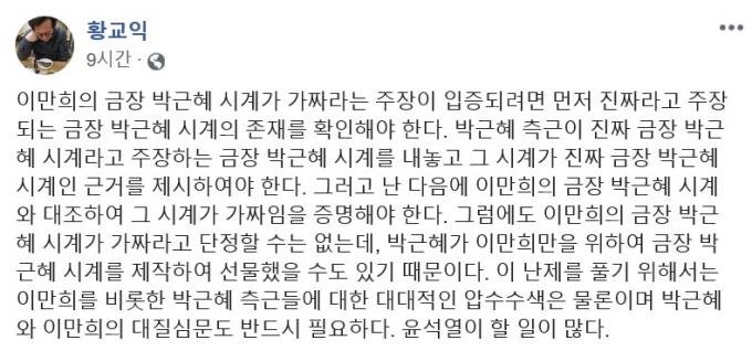 황 씨는 3일 자신의 페이스북에 글을 올려 "이만희의 금장 박근혜 시계가 가짜라는 주장이 입증되려면 먼저 진짜라고 주장되는 금장 박근혜 시계의 존재를 확인해야 한다"고 밝혔다.