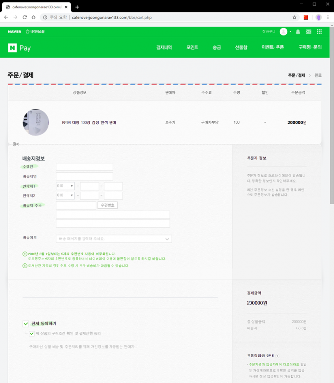 해당 피싱 사이트에서 마스크 반값 할인 판매 페이지에 들어가 네이버페이 구매 버튼을 누르면 해당 제품 구매 확인 버튼이 나오고 승인 시 네이버 로그인 화면이 나온다. 네이버 로그인 화면 역시 가짜지만 정교하게 만들어 쉽게 구분하기 어렵다. 로그인을 하면 네이버 아이디(ID)와 비밀번호(password)를 수집하고 결제 대금뿐만 아니라 심지어 배송 주소까지 가로채기를 한다.