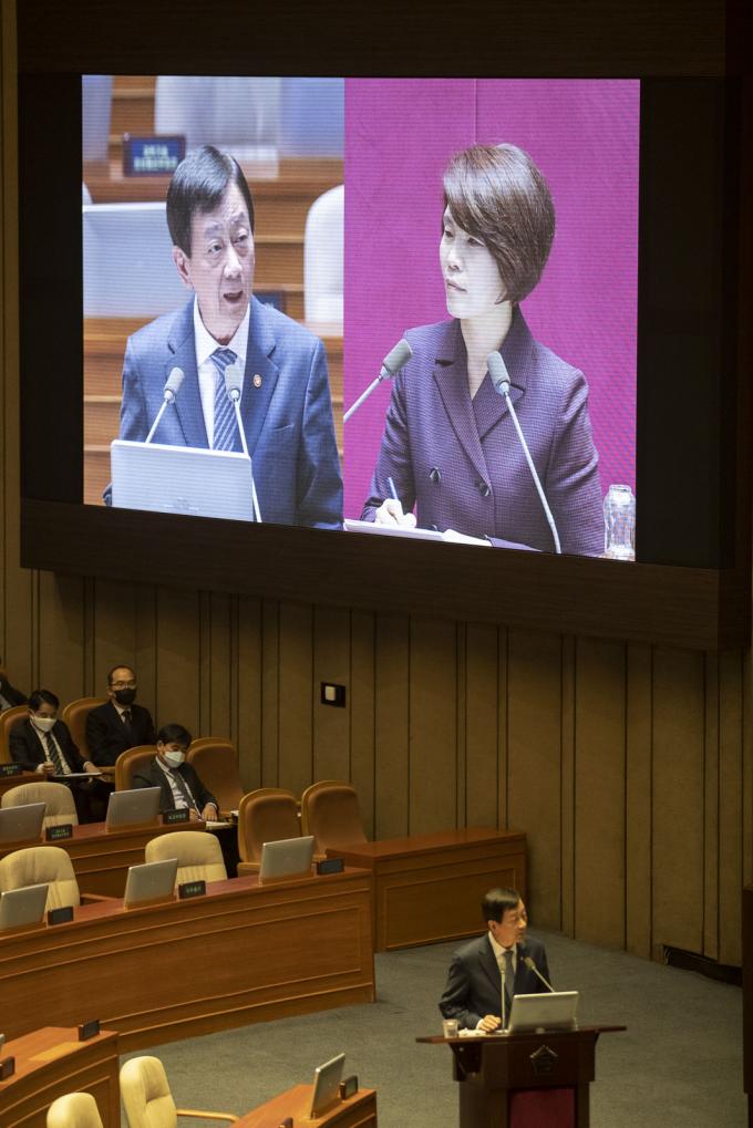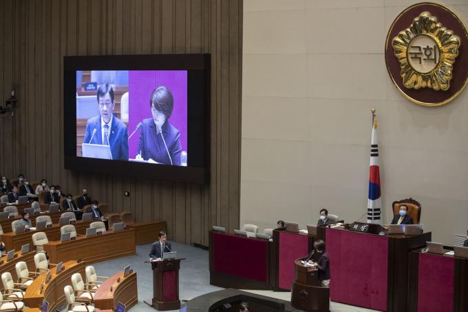 진영 행정안전부 장관(왼쪽)이 4일 오후 서울 여의도 국회에서 열린 제376회 국회(임시회) 제7차 본회의 대정부질문에 출석해 더불어민주당 한정애 의원 질의에 답하고 있다.