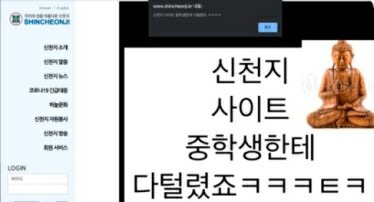 이날 오전 신천지 홈페이지 내 '코로나19 관련 신천지예수교회에 대한 가짜뉴스 Q&A' 페이지에 들어가면 '신천지 사이트 중학생한테 다 털렸죠 ㅋㅋㅋㅋ'라는 팝업과 함께 불상 사진이 등장했다.