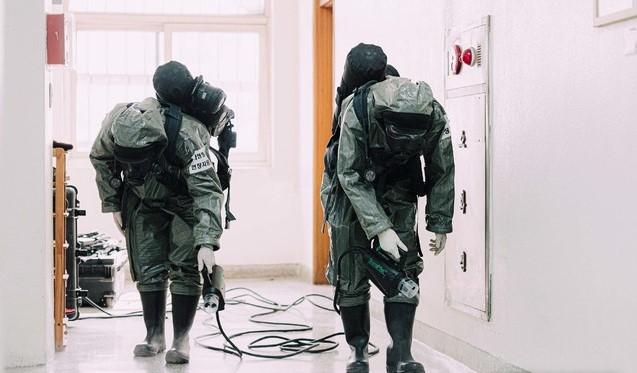 ▲국군화생방방호사령부 특임대 시설내부방역팀이 지난 4일 과산화수소 이온 발생기를 이용해 대구시 북구 산격동 경북대학교에서 '코로나19' 방역 지원을 하고 있다. [국방부 제공]