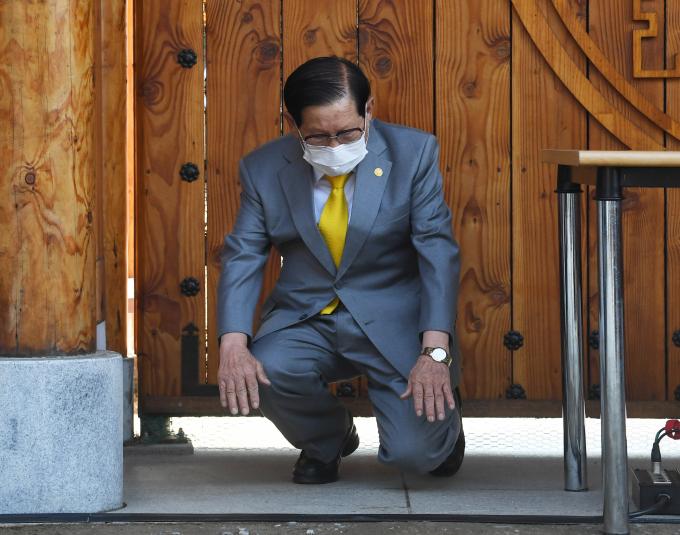 ▲ 신천지 총회장 이만희가 지난 2일 오후 경기 가평 신천지 평화의궁전에서 열린 기자회견 중 무릎 꿇고 사죄하고 있다. [문재원 기자]