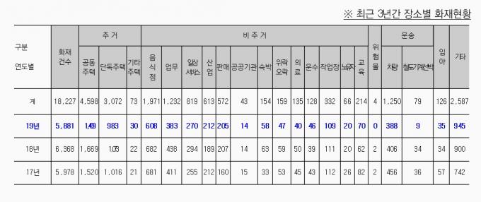 화재가 난 장소별로는 주거시설이 2422건으로 가장 많았다. 지난해 발생한 5881건의 화재 중 41.2%를 차지했다. 이어 음식점 608건(10.3%), 차량 388건(6.6%) 업무시설 383 (6.5%) 등의 순이었다.