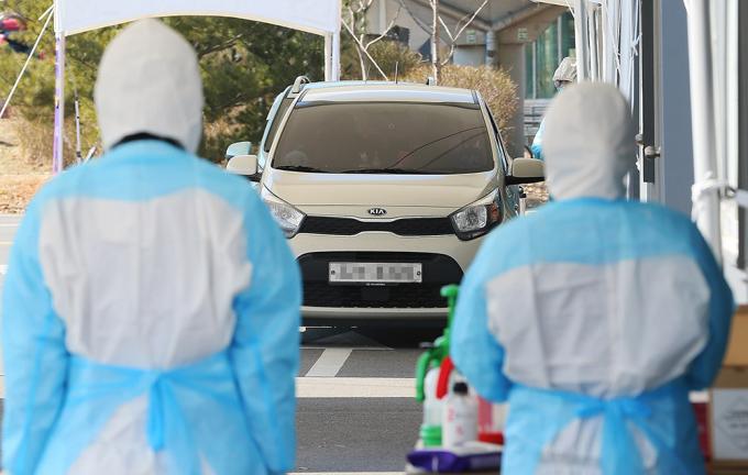 ▲지난 5일 오후 경기 김포 장기동 뉴 고려병원 앞에 마련된 드라이브 스루 선별진료소에서 의료진이 방문자 검체 채취를 준비하고 있다. [뉴시스]