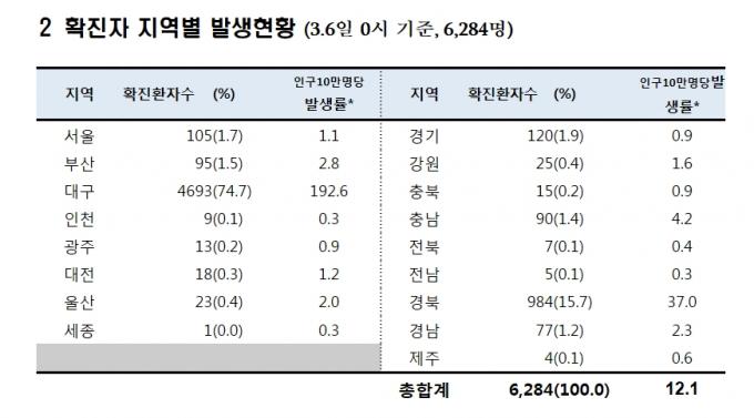 누적 확진자의 지역별 분포는 대구가 4693명, 경북이 984명이다. 이 두 지역을 합한 확진자 수는 5677명으로 전체 확진자의 90% 가량을 차지한다.