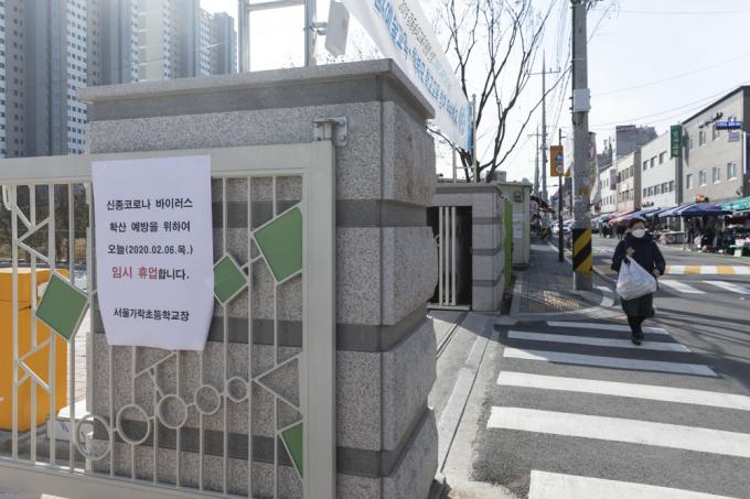 ▲ 서울시교육청은 6일 서울시 유치원과 초‧중‧고등학교 교사들은 개학 추가연기기간인 3월 9일부터 22일까지 순환근무를 실시하라는 내용을 안내했다. 사진은 신종 코로나바이러스 감염증 확진환자가 서울 송파구에 거주하는 것으로 확인된 지난 6일 오후 서울 송파구 가락초등학교 정문에 '신종 코로나바이러스 확산 예방을 위한 임시 휴업' 안내문이 붙어있는 모습. [문재원 기자]