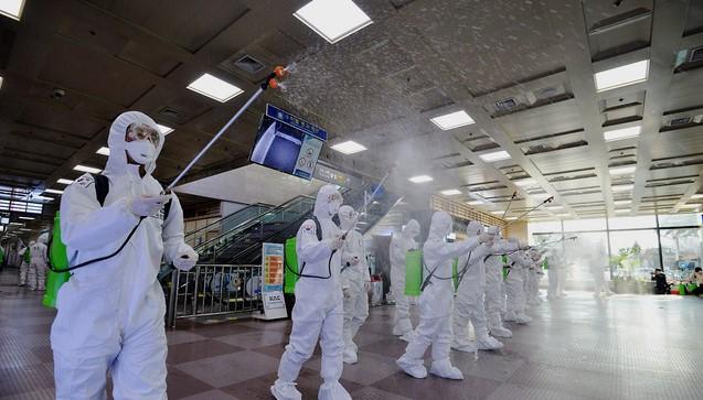 ▲'코로나19 확산을 막기 위해 육군 50사단 장병들이 6일 오후 대구국제공항 입국장에서 방역작전을 펼치고 있다. [뉴시스]